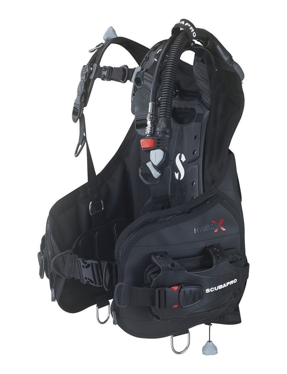 Las dos anillas en D de acero inoxidable proporcionan puntos de enganche para accesorios adicionales. Además, el Hydros X dispone de una matriz de accesorios multimontaje con numerosas anillas D y puntos de anclaje que facilitan el acople de accesorios de buceo adicionales.